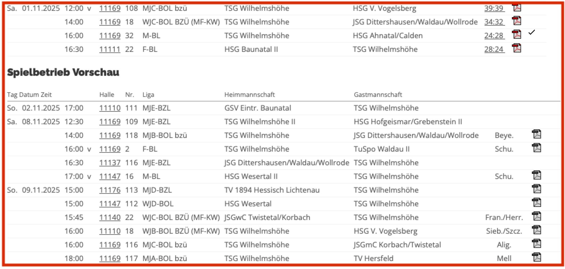 Die Spiele aller Mannschaften können unter nuLiga Handball TSG Wilhelmshöhe eingesehen werden.