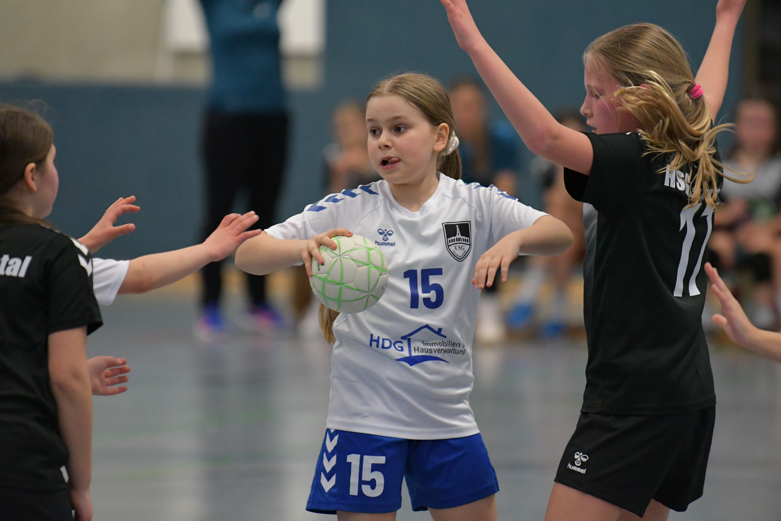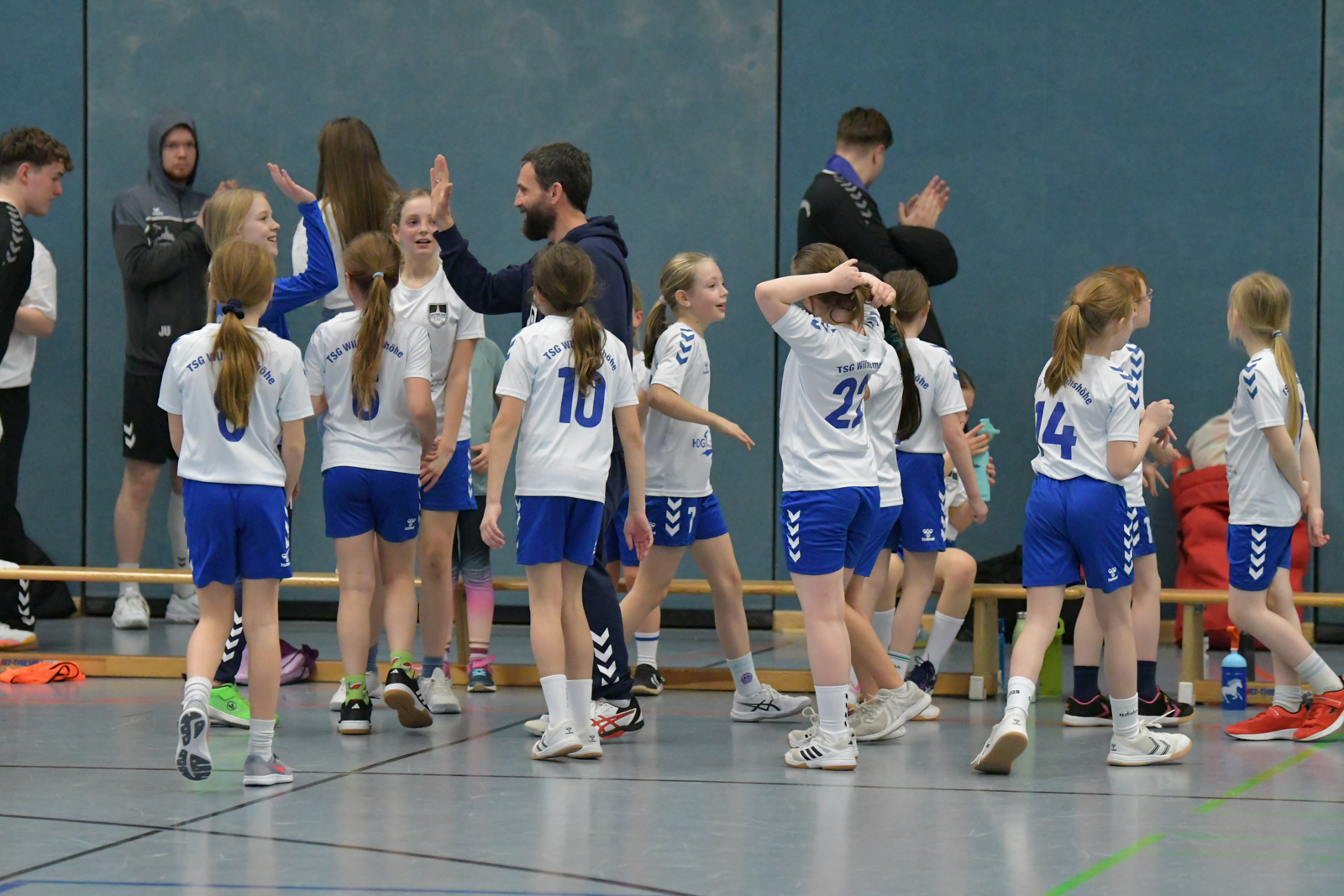 wE gewinnt gegen Spitzenreiter HSG Baunatal. Männer laufen mit ein.