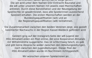 Statement zu Kooperation mit der GSV Eintracht Baunatal und zu Post der HSG Ahnatal/Calden